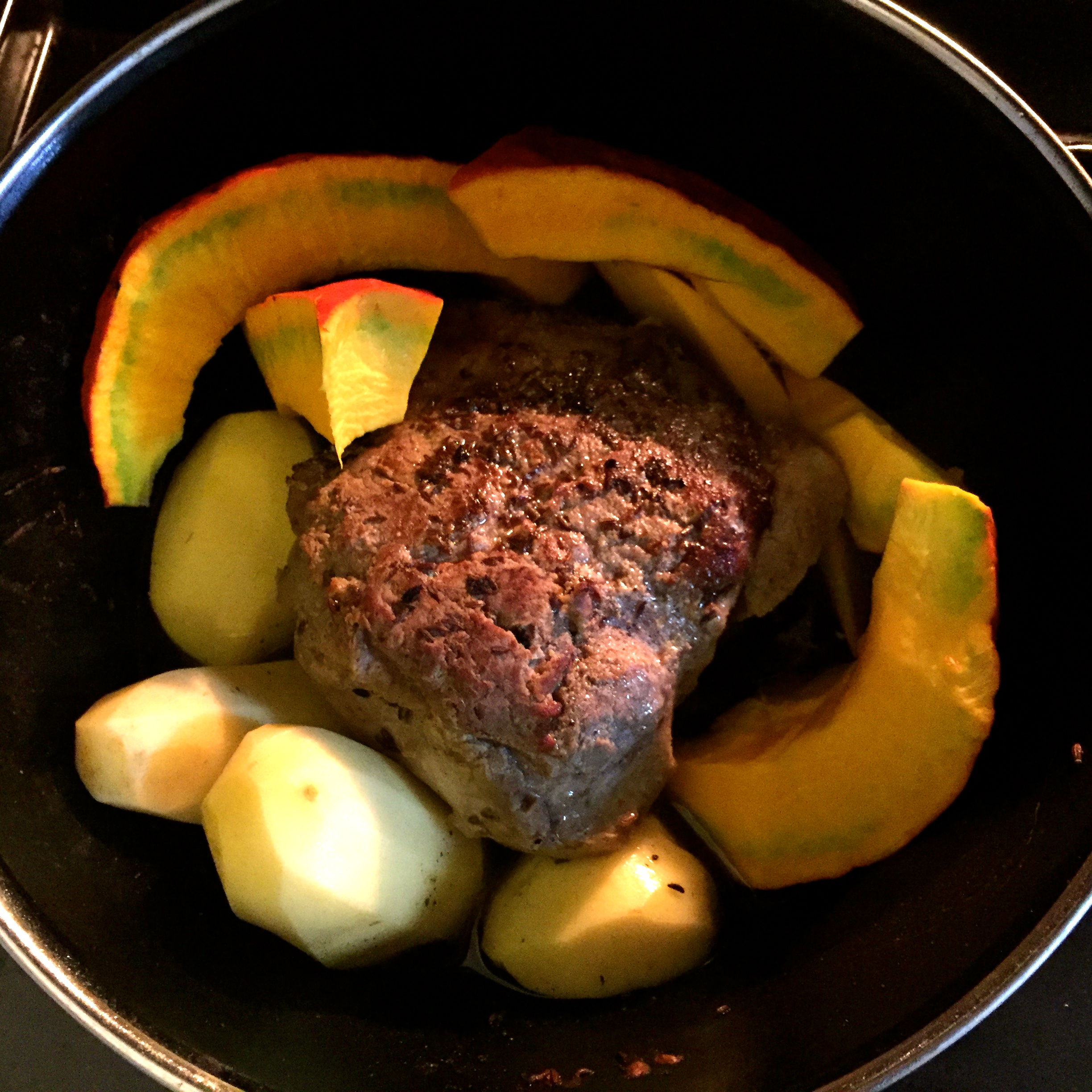 Den Braten nach einer halben Stunden wenden. Bei mir hat es als Beilage Kürbis und Kartoffel gegeben. Die Kartoffel waren für meinen Liebesten weil der keinen Kürbis mag – kann ich mir auch nicht erklären. Die hab ich auch gleich nach dem wenden in die Pfanne gegeben. Wichtig ist den Braten ca. alle viertel Stunde mit dem eigenen Saft zu übergießen um ihn nicht zu trocken werden zu lassen. Nach 1,5 Stunden dürfte der Braten fertig sein.