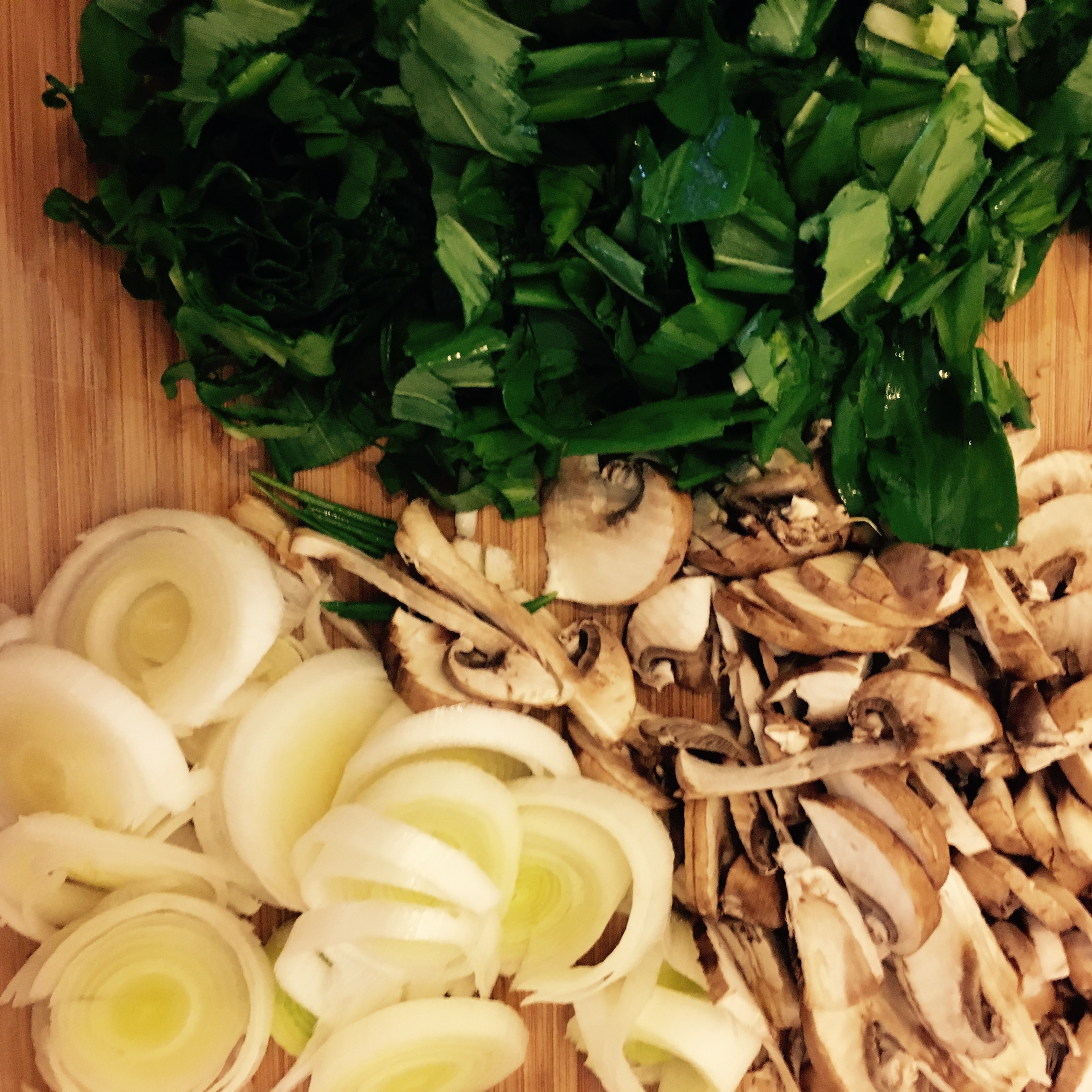 Die Champignons putzen und schneiden. Den Lauch der Länge nach durchschneiden, waschen und danach noch schneiden. Den Bärlauch auch unter fließendem und kalten Wasser waschen und danach, wenn möglich, in einer Salatschleuder etwas trocken. Danach in ca. 2-5mm große Streifen schneiden.